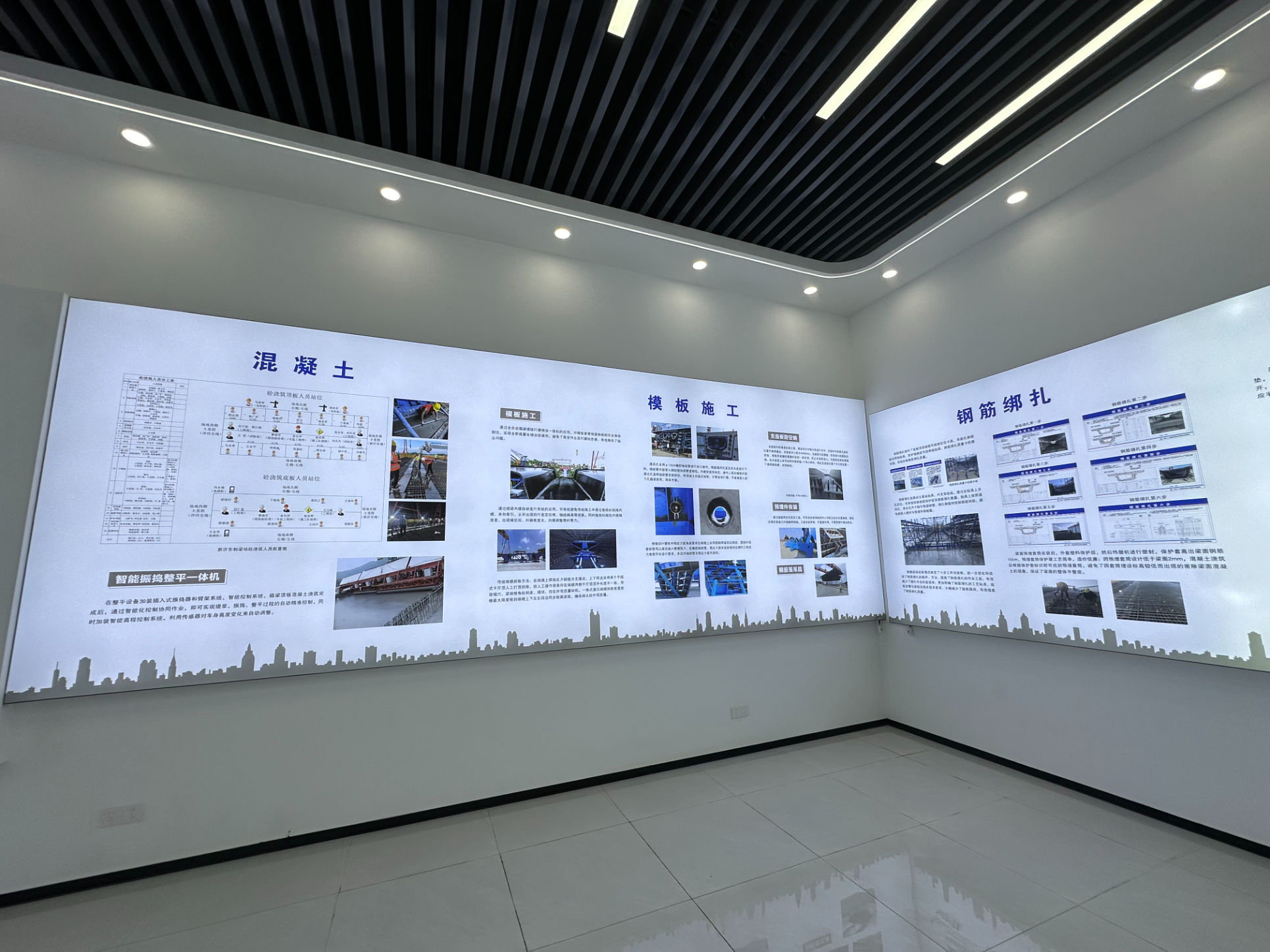 從體驗(yàn)館正面感應(yīng)門(mén)進(jìn)入后,首先映入眼簾的是安全體驗(yàn)館的核心部分——信息化控制中心。大屏幕連接著制梁場(chǎng)的數(shù)據(jù)可視化界面,能監(jiān)控整個(gè)制梁場(chǎng)的拌合機(jī)狀態(tài)、重要施工區(qū)域監(jiān)控等數(shù)據(jù)。